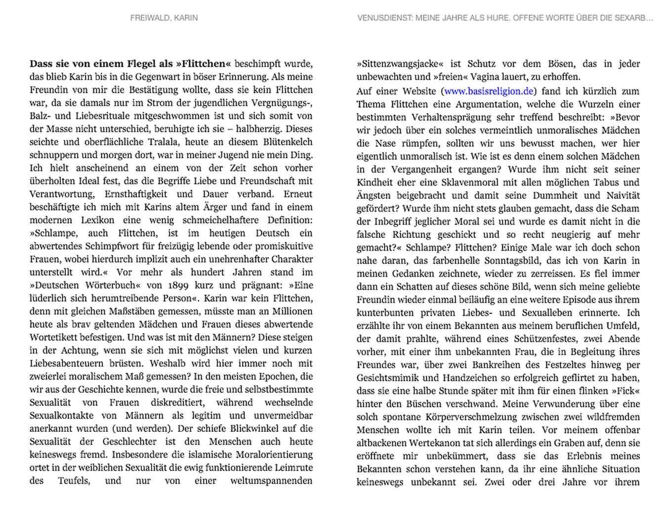 Mit FLITTCHEN wird abfällig ein Mädchen bezeichnet, das leicht zu haben ist, das also mit relativ häufig wechselnden Partnern Geschlechtsverkehr hat. Die Bezeichnung Flittchen ist etwas veraltet, heute sagt man eher Schlampe. Wohl kein Mädchen möchte in den Ruf kommen, ein Flittchen zu sein. Vorsicht vor harten Urteilen! Arroganz ist auf alle Fälle fehl am Platz! Bevor wir jedoch über ein solches vermeintlich unmoralisches Mädchen die Nase rümpfen, sollten wir uns bewusst machen, wer hier eigentlich unmoralisch ist. Wie ist es denn einem solchen Mädchen in seiner Vergangenheit ergangen? Wurde ihm nicht seit seiner Kindheit eher eine leibfeindliche Spießermoral (oder auch „Hosenscheißermoral“ oder Sklavenmoral ) mit allen möglichen Tabus und Ängsten beigebracht und damit seine Dummheit und seine Naivität gefördert? Wurde ihm nicht stets glauben gemacht, dass die Scham der Inbegriff jeglicher Moral sei und wurde es nicht damit in die falsche Richtung geschickt und so recht neugierig auf mehr gemacht? Wurde nicht statt wirklichem christlichen Glauben ihm stets nur die zum Aberglauben verkommene pharisäische Form beigebracht (siehe Pharisäer), die nun wirklich nicht als Anregung für ein Lebenskonzept zum Gelingen der Einheit von Leib und Seele dienen konnte? Hatte denn irgend jemand eine Verantwortlichkeit verspürt, Information für eine bessere Menschenkenntnis und besseres Realitätsbewusstsein zu geben und Strategien zu erklären, auch danach zu leben? Und wo waren denn die Emanzen, die angeblichen Vorkämpferinnen für Frauenwürde und gegen die Herabsetzung von Frauen, sind es nicht auch sie, die üblicherweise die jungen Mädchen glauben machen, dass es zu ihrer angeblichen Emanzipation gehöre zu lieben, auf wen auch immer sie Appetit haben? Und so hat sich auch dieses Mädchen entsprechend verhalten - und nun bezeichnet man es als Flittchen. Dabei ist es doch nur das Produkt seiner ach so sauberen und in Wirklichkeit jedoch scheinheiligen Umwelt. Wenn nichts an Sex passiert, wird man auch kein Flittchen! Mädchen äußern immer wieder Bedenken, dass man sie als Flittchen bezeichnen könnte, wenn bekannt würde, dass sie mit verschiedenen Jungen oder/oder Männern befreundet seien und vielleicht auch Hautkontakterfahrungen haben. Sie dürfen sich beruhigen: Von allen Dingen, die sich nicht herumsprechen sollen, spricht sich nichts so schnell herum wie das, was unter einer Bettdecke passiert - oder eben nicht passiert. Und wenn ein Mädchen, das im Verdacht steht, ein Flittchen zu sein, dann einmal mit einem Jungen näher zusammen ist, kann dieser sehr schnell feststellen, wes Geistes Kind es wirklich ist. So leicht lässt es sich nicht verbergen, ob jemand auf Befriedigung aus ist oder dieses Ziel krampfhaft unterdrückt wirde oder ob dieser jemand eine Spontaneität entwickeln kann, der man anmerkt, dass es um eine reine unschuldige Freundschaft geht. Allerdings beruht solche Erkenntnis des anderen auch auf Gegenseitigkeit, so wie der andere einen selbst erkennen kann, kann man selbst auch den anderen erkennen. Zitat dieses Stichworts in der Biografie einer Hure Ein Freund machte mich auf das Buch "Venusdienst, meine Jahre als Hure - Offene Worte über die Sexarbeit" aufmerksam, weil es sehr realistisch geschrieben ist, vor allem auch, wie ein Mädchen zu "so etwas" kommt. Ich habe natürlich in dem Buch gelesen und stieß recht bald auf das Zitat dieses Stichworts, als sich die Autorin darüber Gedanken macht, wie es bei ihr zu ihrem "Venusdienst" kam. Indirekt gibt sie darin zu, dass es mit ihr in ihrem Leben höchstwahrscheinlich anders gelaufen wäre, wenn sie nicht von Kind an in die falschen Richtungen einer Scheinmoral geschickt worden wäre. Siehe den betreffenden Ausschnitt aus dem Buch "Venusdienst".