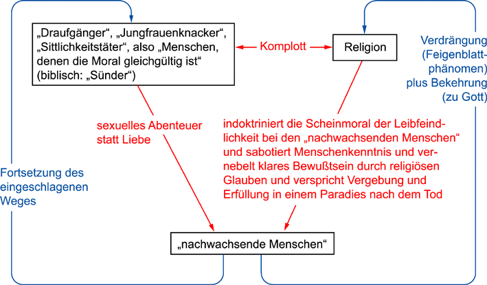 Nicht nur die Sachen der Politik, der Wirtschaft und der Religion sind die weltbewegenden! Von Bedeutung ist vor allem auch das ganz kleine Glück jedes einzelnen Menschen, wie läuft das mit seiner Einheit von Leib und Seele, also mit den zwischenmenschlichen Beziehungen, wie läuft das mit Liebe und Partnerschaft? Wie kommt es da zu Problemen, wie hängt das alles mit Glück und Unglück zusammen? Wie kann man das alles, was nachteilig ist, vermeiden, was kann man künftig besser machen? Der Teufel sitzt immer im Detail - also kümmern wir uns um die Details! Wie das nun mit den ersten Abenteuern im Leben junger Menschen passiert, wurde etwa in den Vertraulichen Gesprächen oder auch in den vier Gesprächen zu beginn des Buchs Spaß an der Moral geschildert: Ein ausgesprochener Don Juan erobert einen der nachwachsenden Menschen und hat unverbindlichen Sex mit ihm. Eigentlich müßte sich nun gerade ein junges Mädchen, mit dem das geschieht, doch dagegen wehren und die Lust verlieren und sich verweigern, denn in seinem ureigensten Interesse ist das ja nun wirklich nicht. Doch irgendwie scheinen die jungen Menschen sehr oft geradezu besessen zu sein, auch noch mitzumachen, und scheinen solche Abenteuer gar nicht erwarten zu können und beginnen schon aus eigenem Antrieb damit, einfach weil sie meinen, dadurch etwa modern zu sein. Jedenfalls kommen sie gar nicht darauf, erst einmal die oktroyierte Leibfeindlichkeit zu überwinden und sich um eine sinnvolle Menschenkenntnis zu kümmern. Es gibt also eine ausgesprochene Täter-Opfer-Beziehung! Ich weiß, von was ich rede, wenn ich das Wort Sabotage verwende... Das Problem einer jeden wirklichen Moral ist doch das, daß sie aus sich heraus vernünftig und einsichtig sein muß, wenn man sich auch wirklich an sie halten soll - und nicht von irgendeinem Glauben her, und sei dieser Glaube noch so großartig. Denn eine von einer anderen Instanz aufoktroyierte Moral, also auch eine von einem Glauben her begründete, wird immer irgendwann als Last empfunden werden und man wird nach Ausreden suchen, daß sie eben in diesem besondern Fall, in dem man sich gerade befindet, nicht gilt... Und nur eine aus sich heraus begründete Moral wird die Phantasie die Menschen ermuntern, Wege zu finden, wie man sie hält. Daher geht es bei basisreligion um eine aus sich heraus vernünftige und einsichtige Moral. Die Funktion Gottes dabei ist, daß wir jemanden haben, den wir bitten können, uns zu dabei helfen, daß wir auch tatsächlich etwa die Informationen erhalten, diese Moral auch zu halten. Und obwohl diese Zusammenhänge längst bekannt sind (siehe etwa das Stichwort Gewissen), scheren sie die Religionen überhaupt nicht. Von Kind an - und gemeint ist hier vor allem auch das bereits bewußt denkende Kind, das bereits Schule und kirchlichen Unterricht besucht - wird das sachgerechte Denken der Menschen im Hinblick auf Moral durch ausgesprochene Leibfeindlichkeit und Vertuschung der Wirklichkeit bis hin zum Glauben an Irrationales vernebelt oder gar zerstört. Und ich weiß, wovon ich rede, wenn ich das Wort Sabotage verwende. Denn seit bald dreißig Jahren versuche ich u. a. die Gespräche zum Thema Liebe den jungen Leuten nahe zu bringen und mit ihnen darüber zu reden und mit ihnen zu Konzepten zu kommen und das klappte auch immer sehr gut, wenn ich Gelegenheit hatte - auch Eltern waren dafür -, aber keine Institution - ob Schule oder Kirche - will das, mit welchen Ausflüchten auch immer. Eine Ausnahme ist möglicherweise der Kölner Kardinal Meisner, aber gegen sein Personal war auch da nichts auszurichten. Obwohl ich ein Schreiben aus seinem Sekretariat vorlegen konnte, daß ich ein Projekt anfangen könnte, wurde mir immer ein solches Projekt verwehrt etwa mit der Ausrede: "Ob der Her Kardinal überhaupt alles gelesen hat, was Sie da schreiben.." Jedenfalls soll ganz offensichtlich nach wie vor den jungen Menschen jede Information und jeder Schneid und vor allem auch die Gelegenheit genommen werden, rechtzeitig (also vor der Pubertät, wenn alles los geht) zu einem effektiven Lebenskonzept zu kommen. Und so werden die nachwachsenden Menschen wieder genauso wie die Komplott-Menschen: Die einen kommen mit dieser Lebensweise nicht so recht klar, bereuen, was sie getan haben und verdrängen das, weil es unangenehm war (das Feigenblattphänomen in Anlehnung an Adam und Eva, die mit Feigenblättern ihre schlimme Tat verdrängten!) und bekehren sich zu Gott und engagieren sich in der Religion (und indoktrinieren jetzt ihrerseits die nächsten jungen Menschen mit Glauben und Leibfeindlichkeit). Und die anderen gehen den einmal eingeschlagenen Lebensweg weiter und bringen den nächsten jungen Menschen, die ja nichts durchschauen, ihre Weise des Lebens bei: ein Teufelskreis. Natürlich ist das Komplott in beiden Schaubildern im allgemeinen stillschweigend, die Zuständigen in Gesellschaft und Religion unternehmen einfach nichts und die Kapitalisten bzw. die Don Juans zeigen sich erkenntlich, indem sie entweder ansonsten brave Staatsbürger und Steuerzahler sind beziehungsweise werden oder gar die Religionen materiell und ideell unterstützen (letztere natürlich erst, wenn sie alt geworden sind und ihre früheren Sünden sühnen möchten)! Manchmal gibt es allerdings auch eine Personalunion! Dabei hatte sich der historische Jesus gewiß etwas völlig anderes vorgestellt, überhaupt scheinen die christliche Religion und auch die jüdische Religion (Jesus ging es je vermutlich nur um eine Reform der jüdischen Religion) zumindest von ihrem Ursprung her die einzigen Religionen zu sein, für die das diesseitige Paradies der Partnerschaft und Liebe in der Einheit von Leib und Seele Anliegen ist! Doch dazu später! Anmerkungen zum Schaubild: